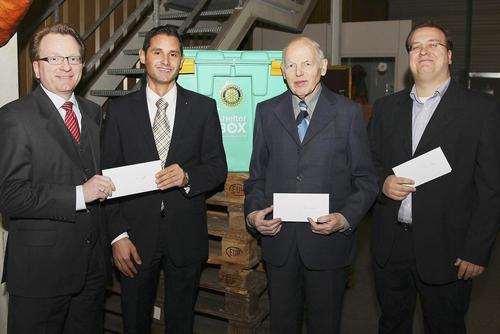 Obernburg/Großwallstadt  Im November hatte der Rotary-Club Obernburg gemeinsam mit dem sinfonischen Blasorchester Sulzbach zum Benefizkonzert in die Frankenhalle Erlenbach eingeladen. Am Donnerstag überreichte Präsident Ulf Kaiser (links) 15 000 Euro an die Empfänger: Der Musikverein Sulzbach (Zweiter von links(richtig muss es heißen: rechts): Markus Rehse) erhielt 1000 Euro für die Jugendarbeit, der Sozialkreis Sulzbach (Dritter von links: Hermann Amrhein) 2000 Euro und Rotaract (rechts (richtig muss es heißen: zweiter von links): Achim Steffan) 3000 Euro für die Aktion Shelterboxen. Weitere Beträge gingen an die Rotarieraktionen End Polio Now (3000 Euro) und Gesunde Kids (4000 Euro) sowie jeweils 1000 Euro an die Marlies-Schleicher-Stiftung Aschaffenburg und die Krebsforschung der Goethe-Universität Frankfurt.
