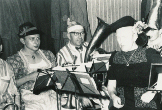 Dieses Bild entstand bei einem Faschingsball Anfang der 50er Jahre. Links ist unser Adolf Eisenträger, der auch heute noch mitspielt, im zarten Alter von etwa 17 Jahren zu sehen.